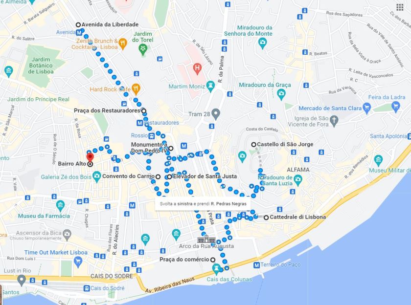 Punto di partenza ideale è la grandiosa Avenida da Liberdade dove, per chi raggiunge Lisbona in auto, è facile trovare parcheggio in uno dei tanti garage disponibili. Da qui si raggiunge inizialmente Praça de Restauradores e poi la bella Piazza con un monumento intitolato a Dom Pedro IV. Proprio in fianco c’è l’ altra bella piazza dove si tŕova il Mercado de Baixa e da cui proseguire sino ad una delle fermate principali del tram 28.