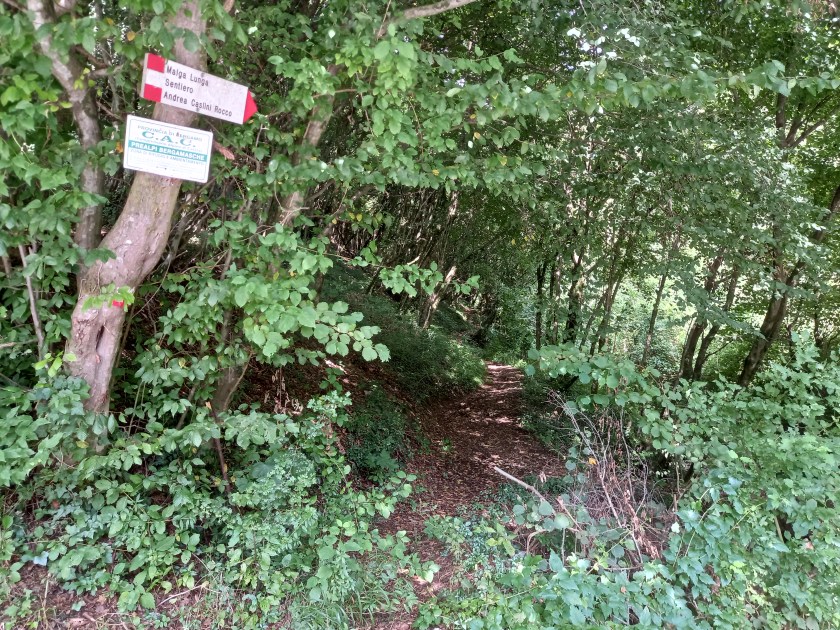 Presa la strada a destra e percorsa la ripida salita per circa 1 km, prima di raggiungere il gruppo di cascine che popolano la zona, si prende la strada che a destra inizia a scendere leggermente e dopo poche centinaia di metri incontra un sentiero a sinistra.