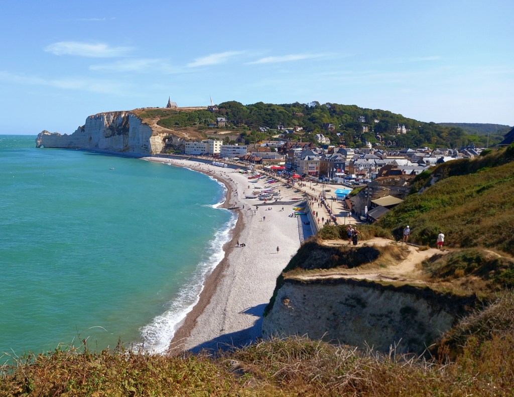 La cittadina di Etretat è molto suggestiva, incastonata tra i due bastioni di roccia che delimitano la baia, con una bella passeggiata che risale i due promontori e da cui osservare il tratto di mare spesso battuto da venti che soffiano da nord.
